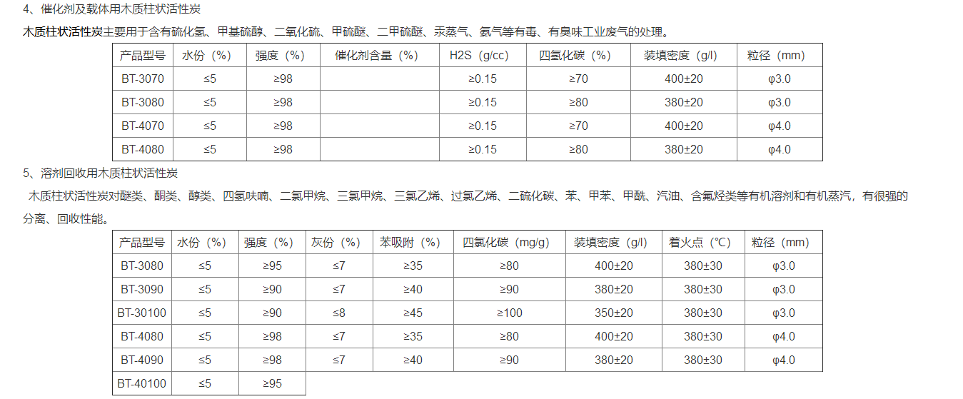 木質(zhì)活性炭主要分為:木質(zhì)柱狀活性炭、木質(zhì)顆粒活性炭、木質(zhì)粉狀活性炭。