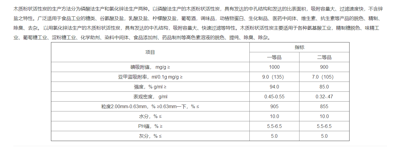 以磷酸法生產(chǎn)的木質(zhì)粉狀活性炭,具有發(fā)達(dá)的中孔結(jié)構(gòu)和發(fā)達(dá)的比表面積,吸附容量大、過(guò)濾速度快,不含鋅鹽之特性。廣泛適用于食品工業(yè)的糖類、谷氨酸及鹽,乳酸及鹽、檸檬酸及鹽,葡萄酒,調(diào)味品,動(dòng)植物蛋白、生化制品、醫(yī)藥中間體、維生素、抗生素等產(chǎn)品的脫色、精制、除臭、去雜。