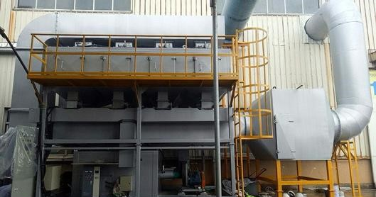催化氧化系統共分為三個區域:第一,換熱區域:脫附后的高濃度、小風量廢氣先通過列管換熱器與高溫熱源進行換熱升溫后,溫度升溫至約為200℃左右,進入第二區域,補溫區域:因為VOCs在催化劑表面發生催化氧化反應的起燃溫度約為300℃,需要通過天然氣補充熱量至300℃;第三區域:催化氧化,有機廢氣升溫至300℃后,經過催化劑表面時會發生催化分解反應,有機廢氣凈化后廢氣達標排放。